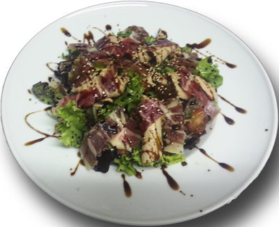 - Ensalada de queso templado con vinagreta de miel y mostaza.